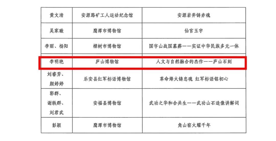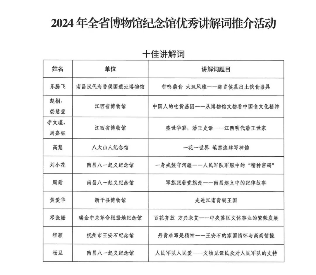 为深入贯彻习近平文化思想和习近平总书记考察江西重要讲话精神,深挖江西优秀历史文化资源,弘扬优秀传统文化,江西省文物局于2024年7月16日举办了“2024年全省博物馆纪念馆优秀讲解词推介活动”。经评委小组评选,我市五篇讲解词荣获优秀奖,分别为:《穿越历史 对话古今》《浪涌石钟 江湖锁钥》《揭开考古的神秘面纱》《璀璨的文明印记》和《人文与自然融合的杰作—庐山石刻》。