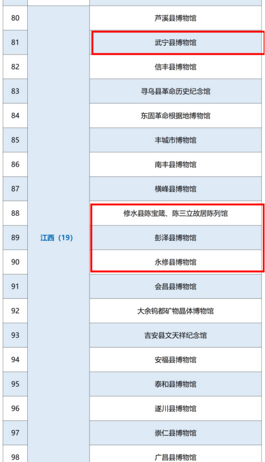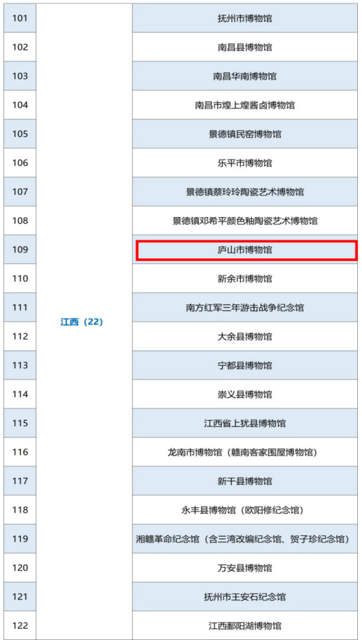 2023年12月,国家文物局指导中国博协启动第五批全国博物馆定级评估工作。根据《博物馆定级评估办法》,中国博协组织专家从1148家申报单位中评出国家一级博物馆123家、国家二级博物馆321家、国家三级博物馆240家。其中,国家一级博物馆评估结果已于5月18日正式公布。此次公布的第五批国家二、三级博物馆名单中,九江上榜国家二级博物馆1家、国家三级博物馆4家,共5家。其中,庐山市博物馆晋级为国家二级博物馆;武宁县博物馆、修水县陈宝箴陈三立故居陈列馆、彭泽县博物馆、永修县博物馆4家博物馆晋级为国家三级博物馆。