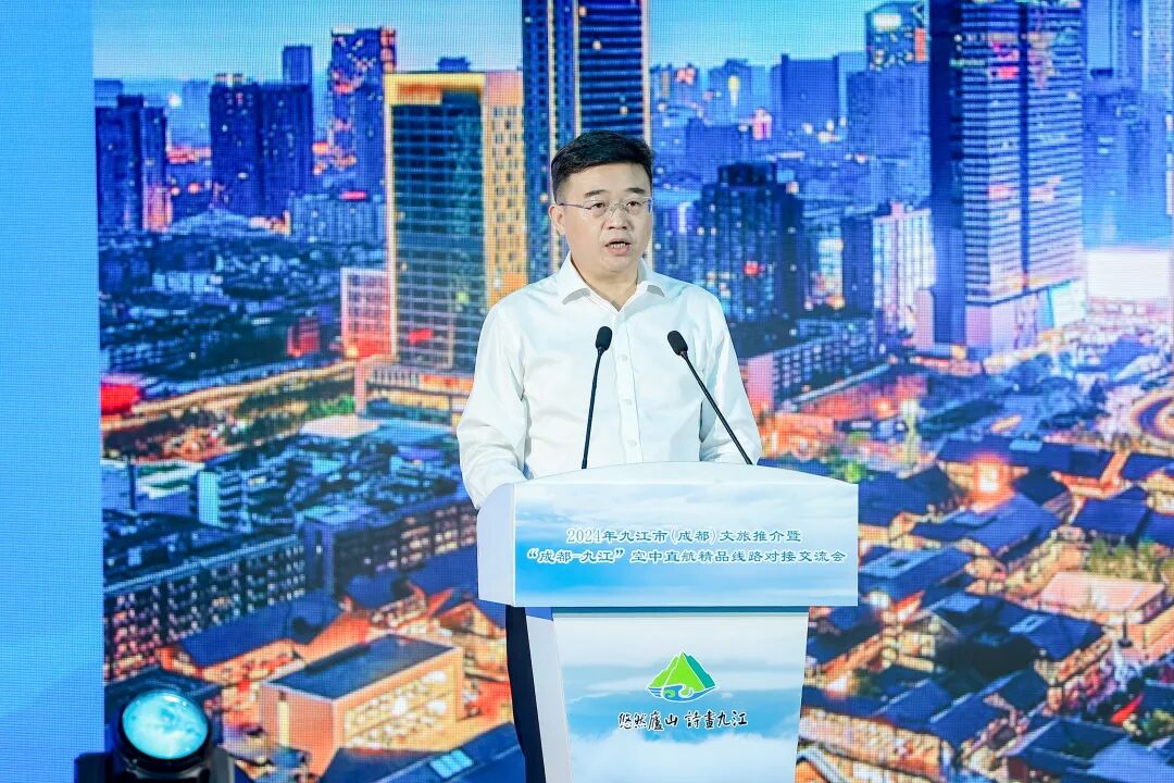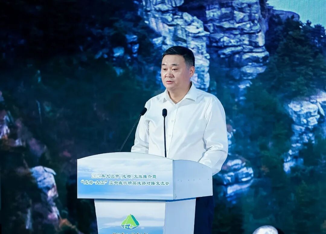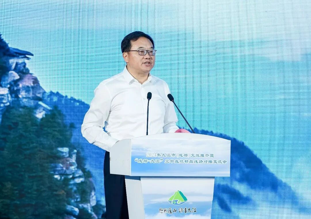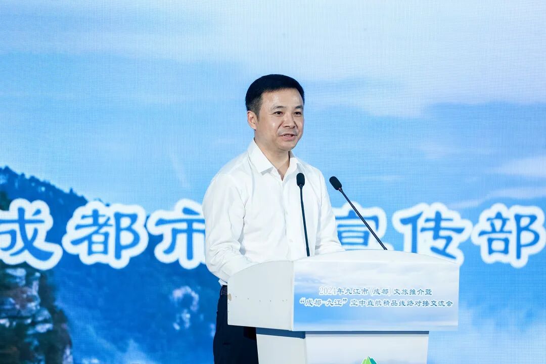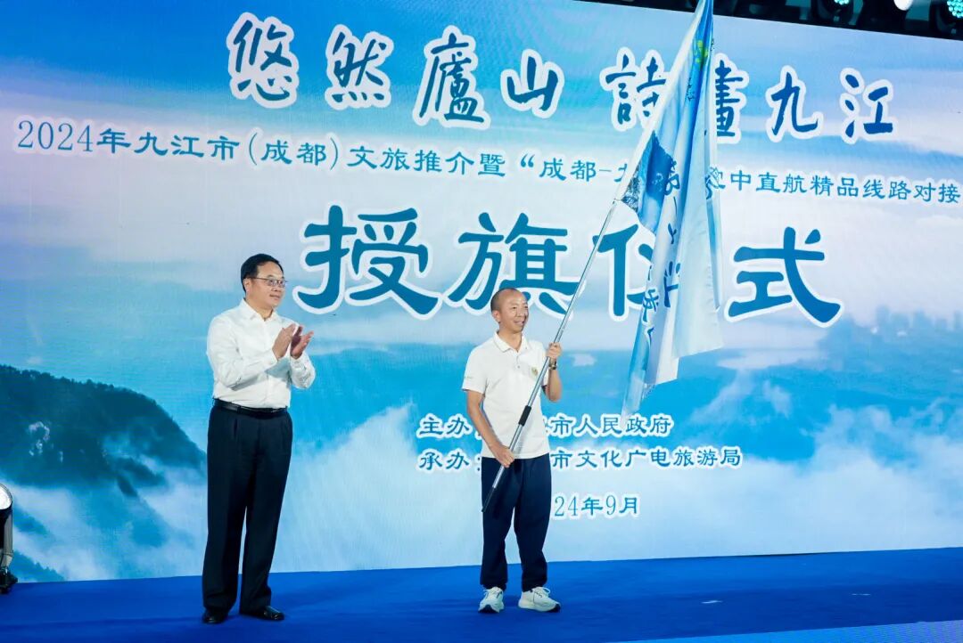 九江市政府党组成员、副市长杜少华致辞并为直航首发团授旗,成都市委宣传部副部长、市文广旅局党组书记、局长邱伟致辞,市政府副秘书长方忠生主持政务环节。九江市文广旅局党组书记、局长王建新作九江文旅专题推介,市文广旅局党组成员、副局长石泉,市文广旅局三级调研员朱小倩,以及九江市重点县(市、区)分管领导及文旅部门相关负责人参加活动。