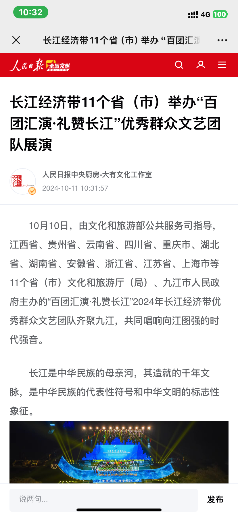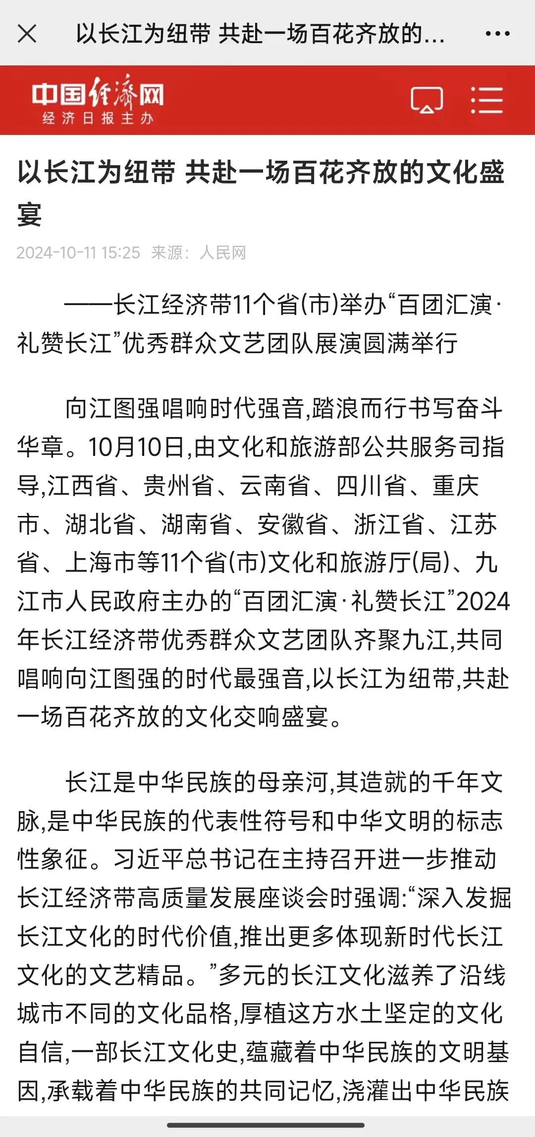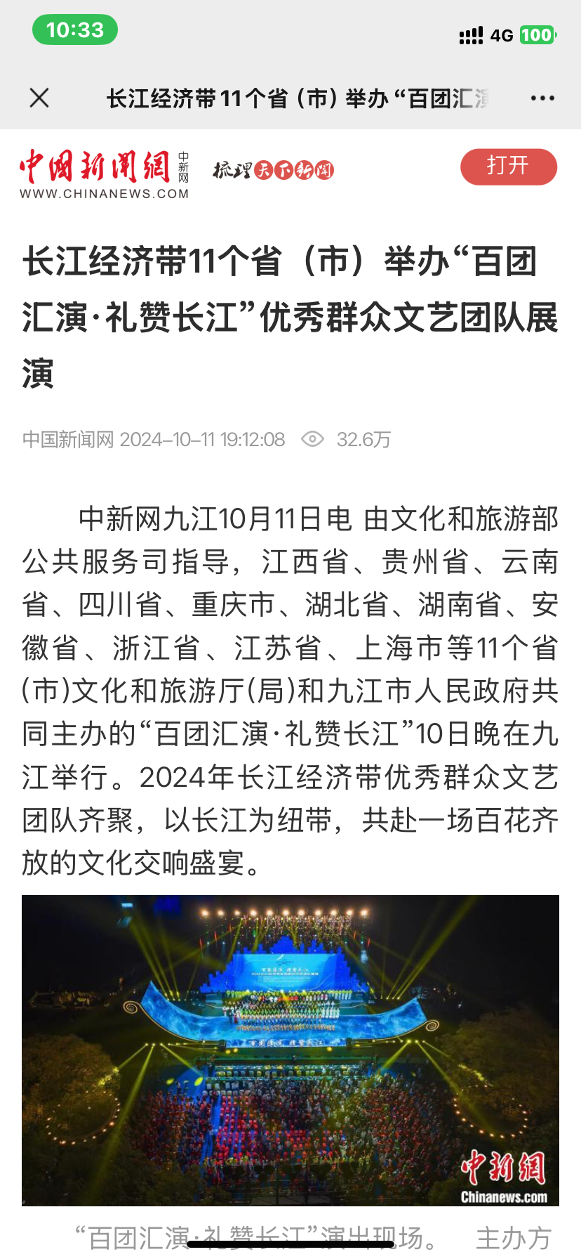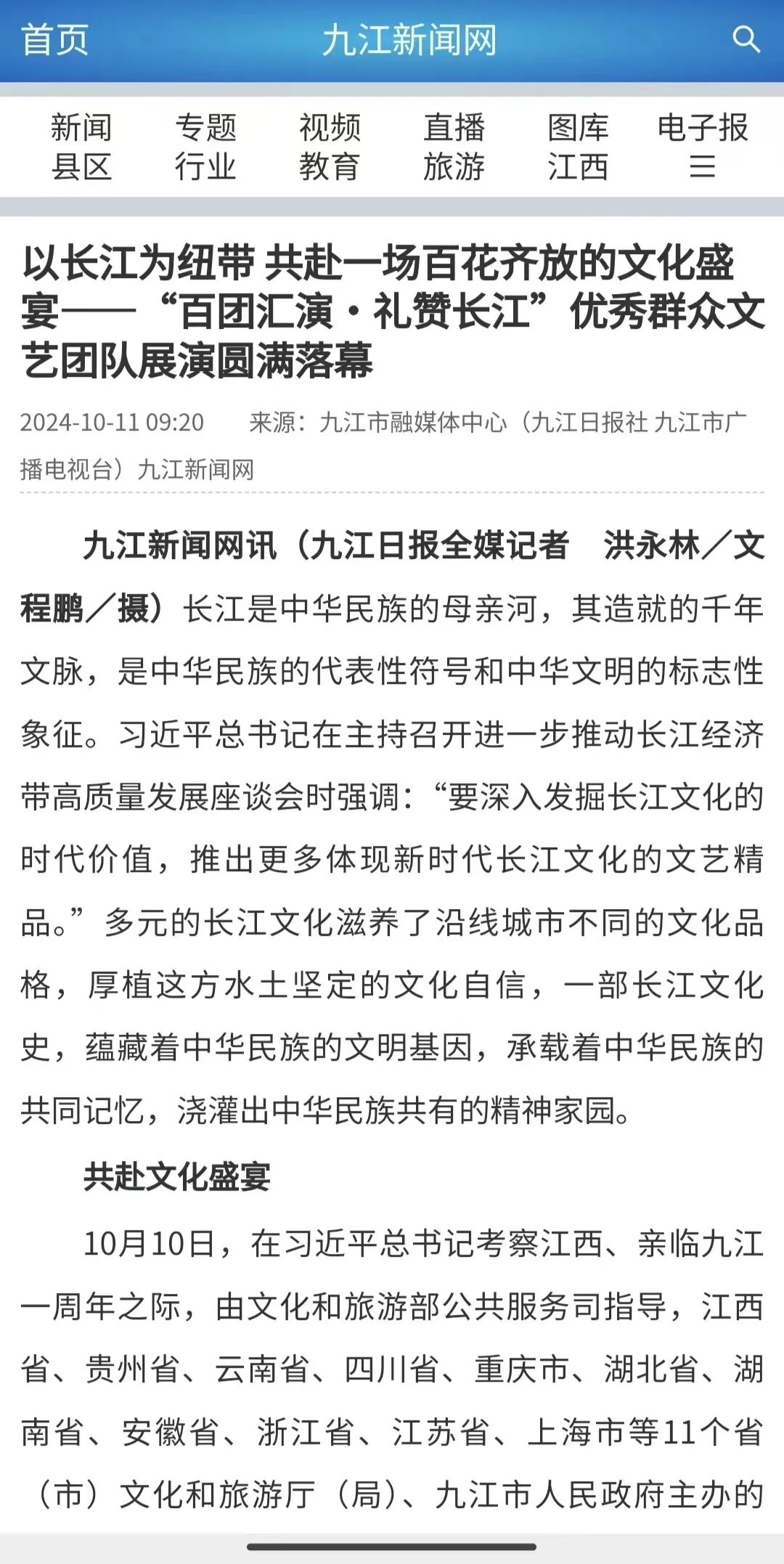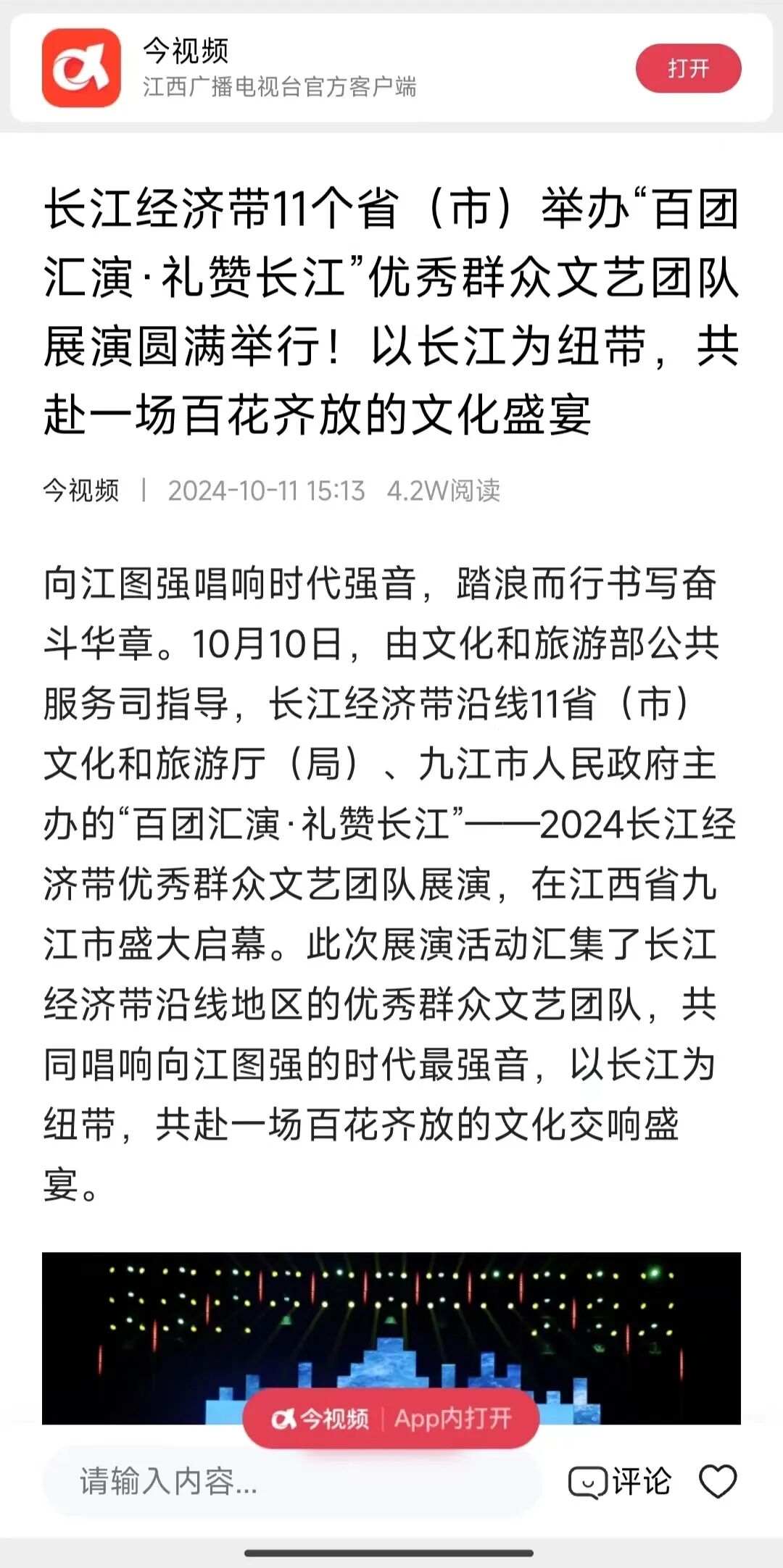 2024年10月10日晚,“百团汇演 礼赞长江”2024长江经济带优秀群众文艺团队展演活动在九江长江国家文化公园镇水牛广场圆满结束。