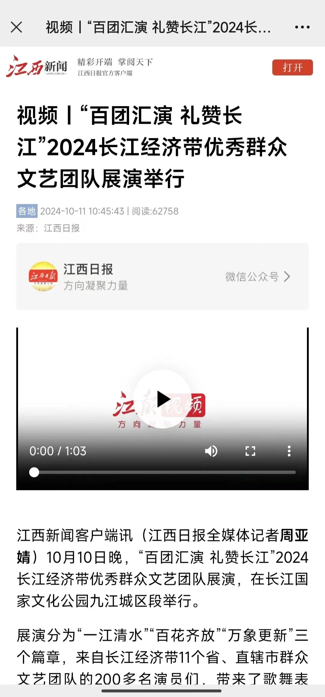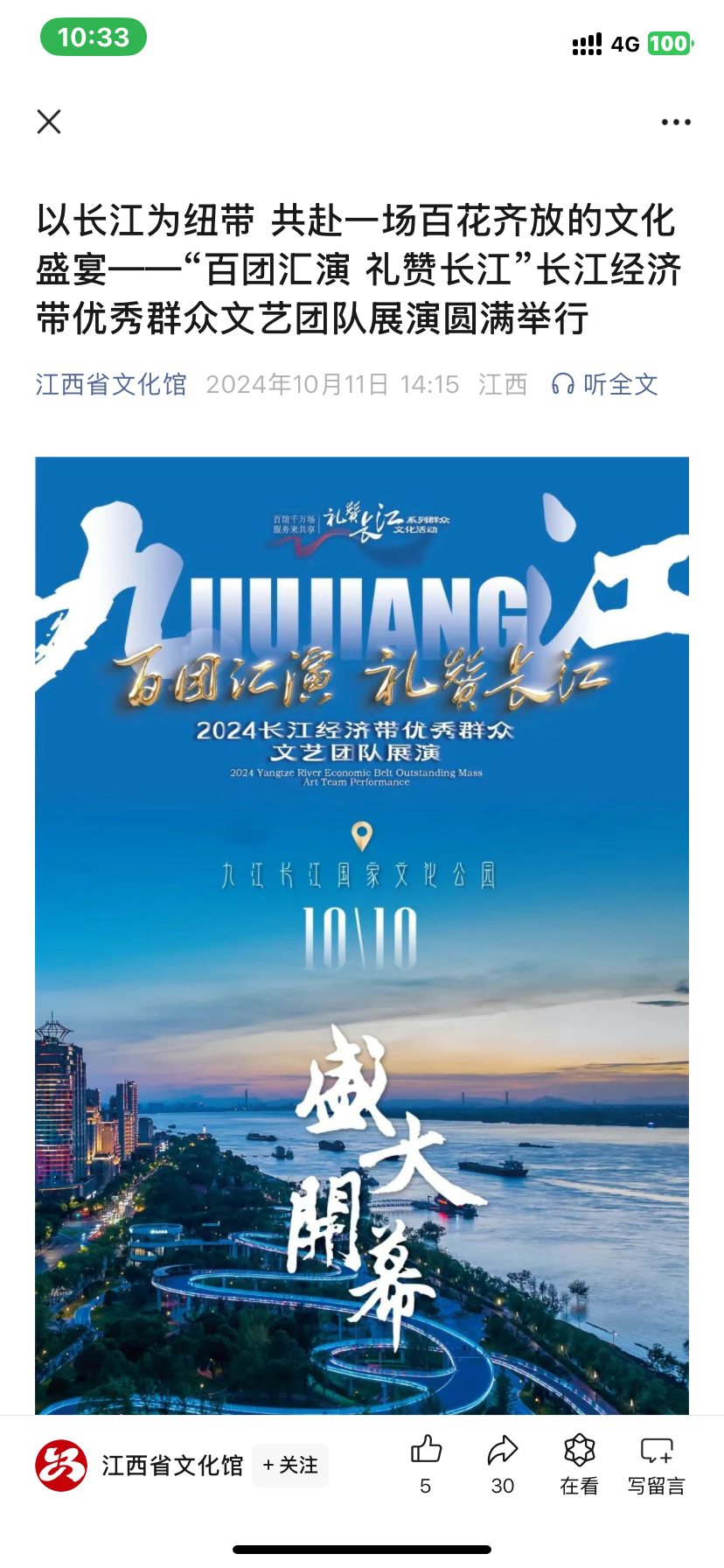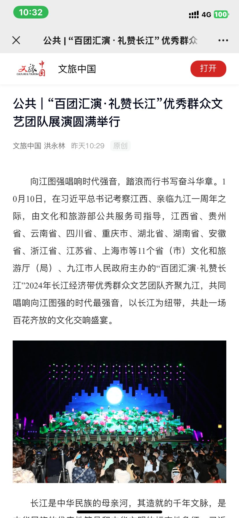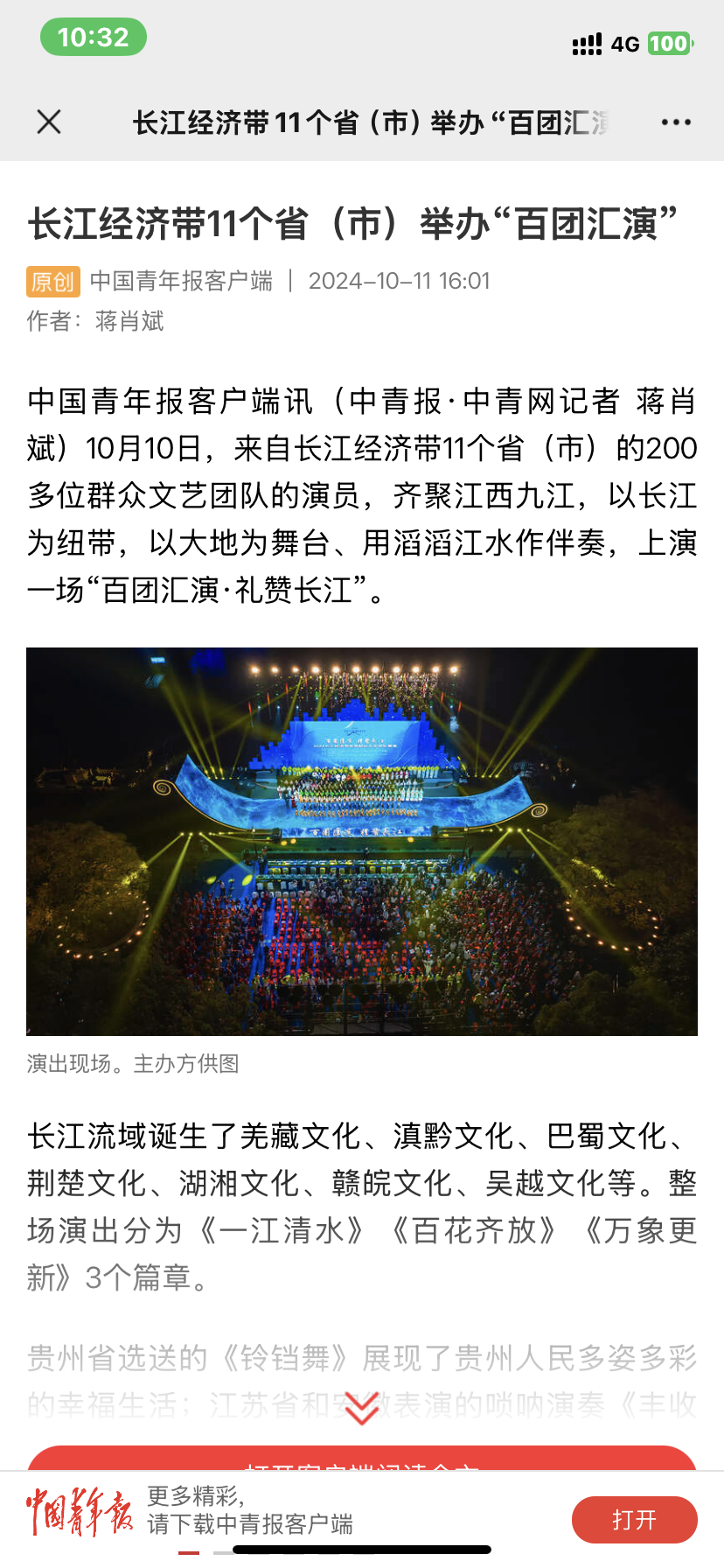 2024年10月10日晚,“百团汇演 礼赞长江”2024长江经济带优秀群众文艺团队展演活动在九江长江国家文化公园镇水牛广场圆满结束。