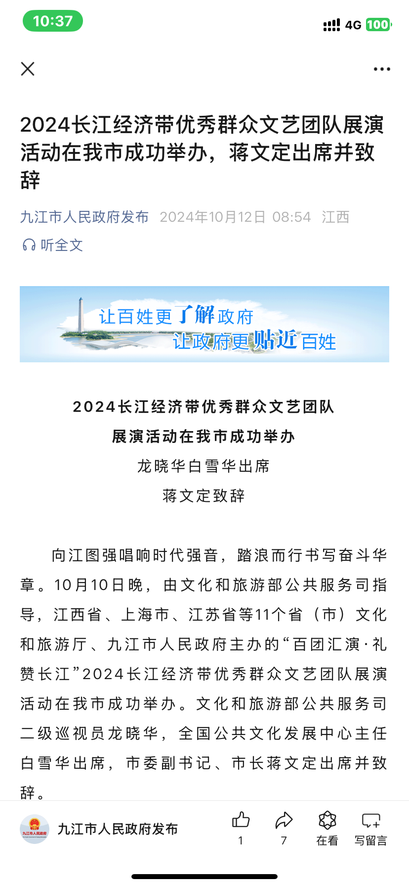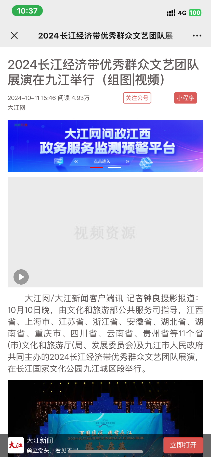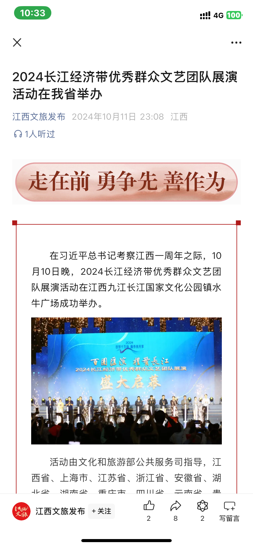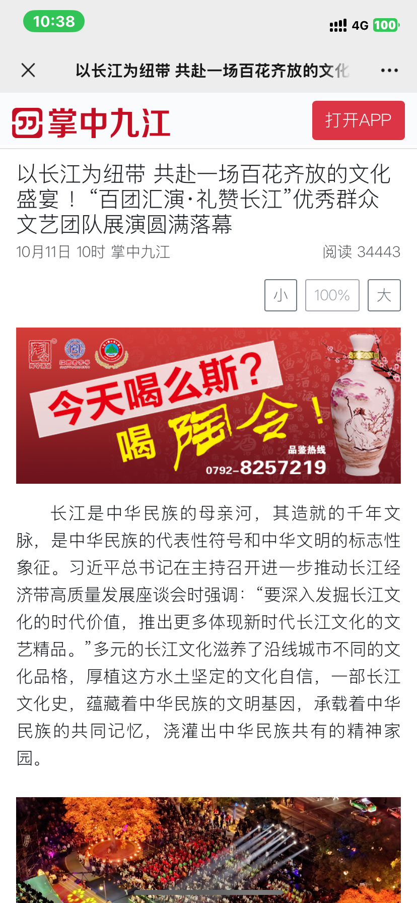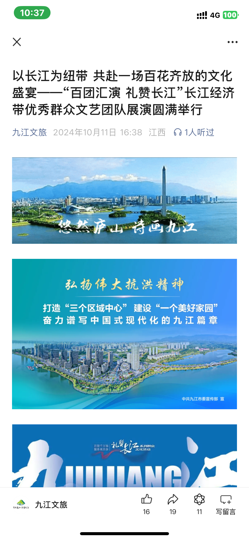 2024年10月10日晚,“百团汇演 礼赞长江”2024长江经济带优秀群众文艺团队展演活动在九江长江国家文化公园镇水牛广场圆满结束。