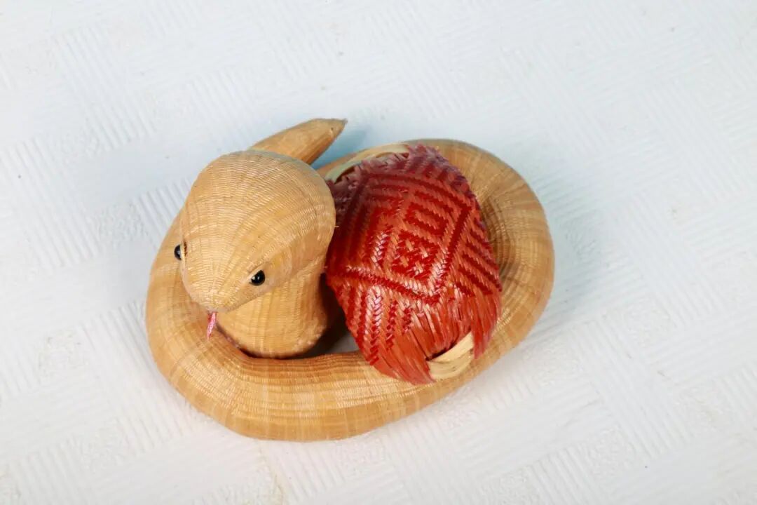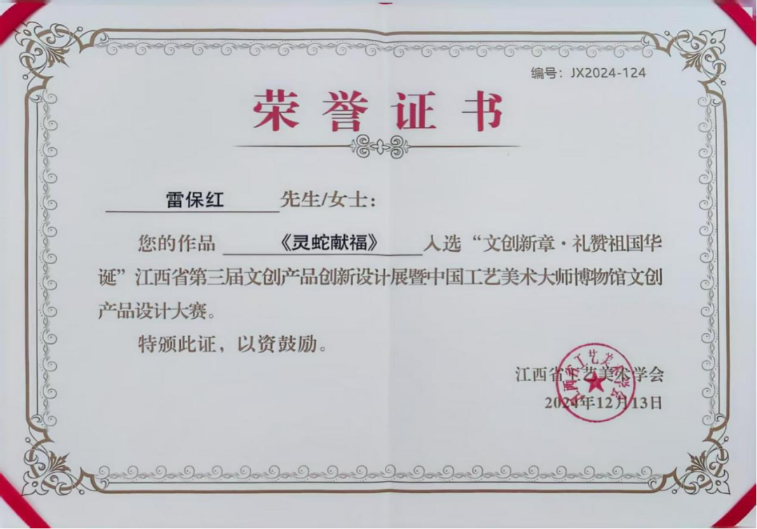 近日,瑞昌竹编省级代表性传承人雷保红老师的作品《灵蛇献福》在“文创新章·礼赞祖国华诞”江西省第三届文创产品创新设计展暨中国工艺美术大师博物馆文创产品设计大赛中脱颖而出。《灵蛇献福》不仅成功入选展览,更被中国工艺美术大师博物馆永久收藏。