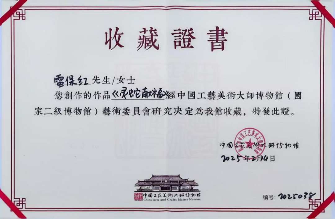 中国工艺美术大师博物馆作为我国唯一专注收藏政府评定工艺美术大师作品的权威机构,集精品展示、技艺传承、学术交流于一体,此次入选无疑是对雷保红老师创作实力的又一次肯定。