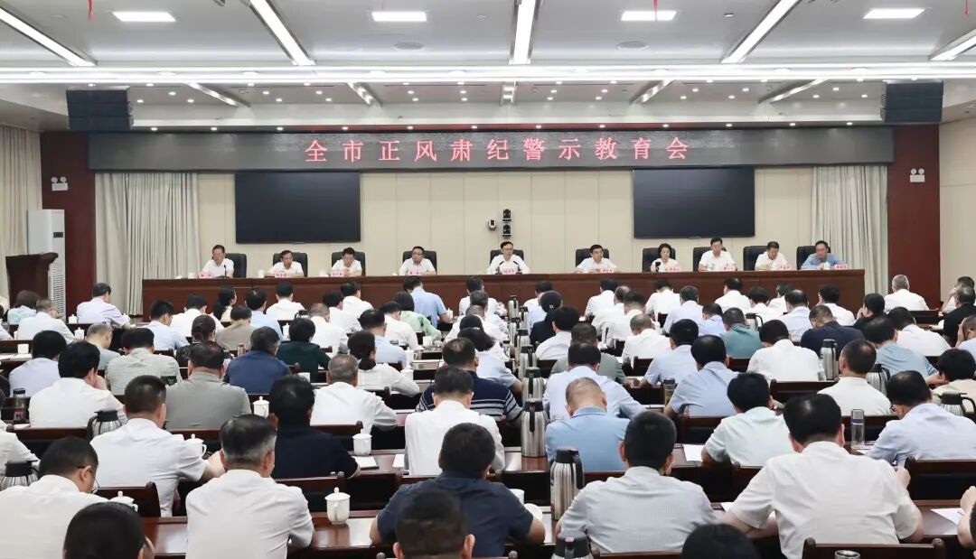 蒋文定、黄强、廖奇志、饶芝新、章剑飞、孙金淼、严盛平、荣学文等市四套班子领导出席,韩潮通报了全市违纪典型案例和纪律审查工作情况并剖析。与会人员观看了警示教育片《绝不退让》。