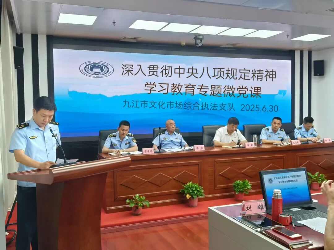 6月30日,九江市文广旅局党组成员、副局长谭勐就深入贯彻中央八项规定精神学习教育,为九江市文化市场综合执法支队全体党员干部及职工讲了一堂专题党课。