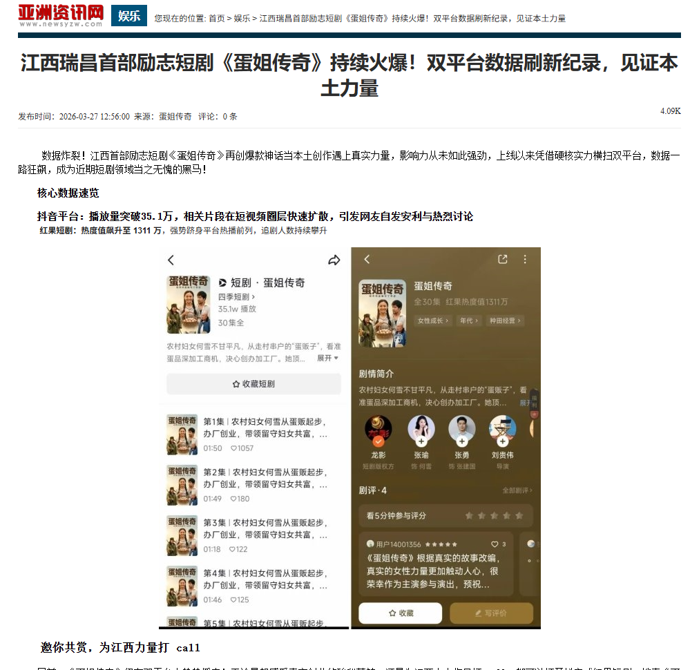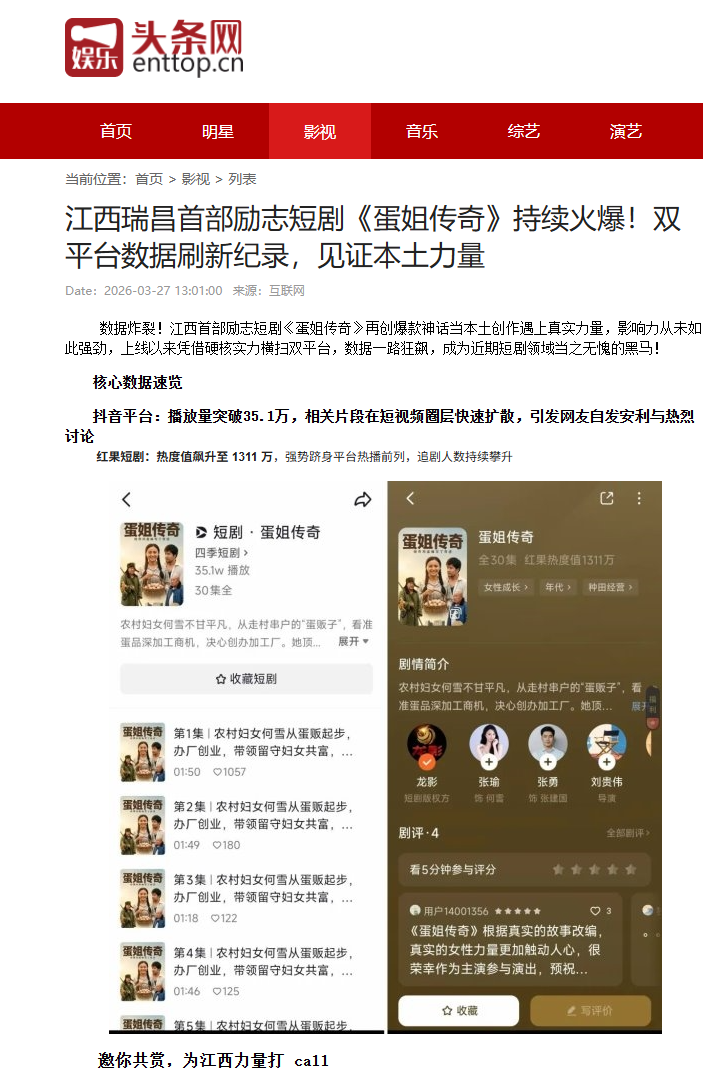 近日,江西瑞昌首部女性励志竖屏短剧《蛋姐传奇》 持续高热播出,凭借真实动人的劳模故事、接地气的乡土叙事与硬核正能量,迅速成为全网热议爆款,收获亚洲电视新闻网、亚洲资讯网、娱乐头条网、八卦娱乐网等海内外主流媒体集中点赞与专题报道,让瑞昌本土文艺创作实力与新时代女性奋斗精神双双出圈。