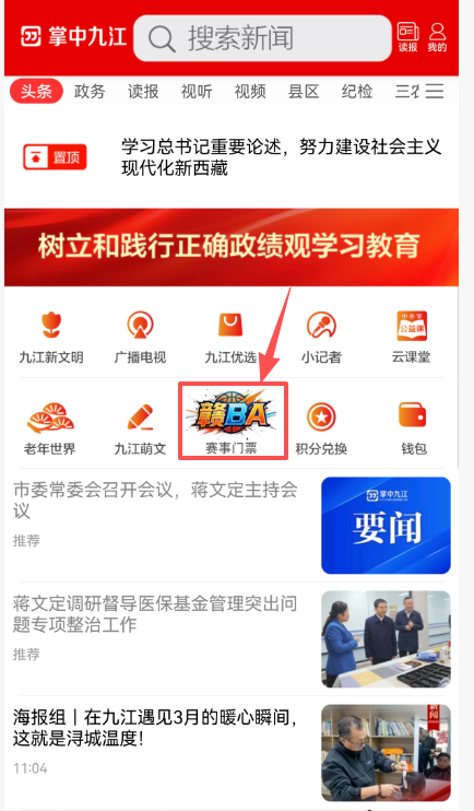 1.打开掌中九江App首页,点击“赣BA赛事门票”