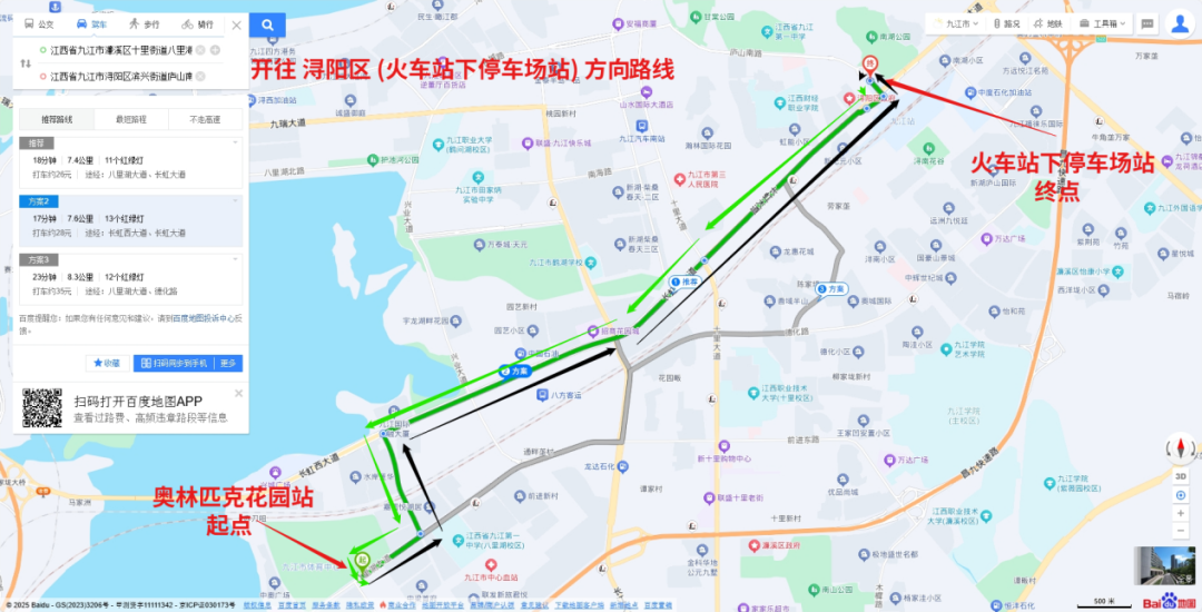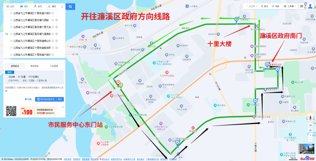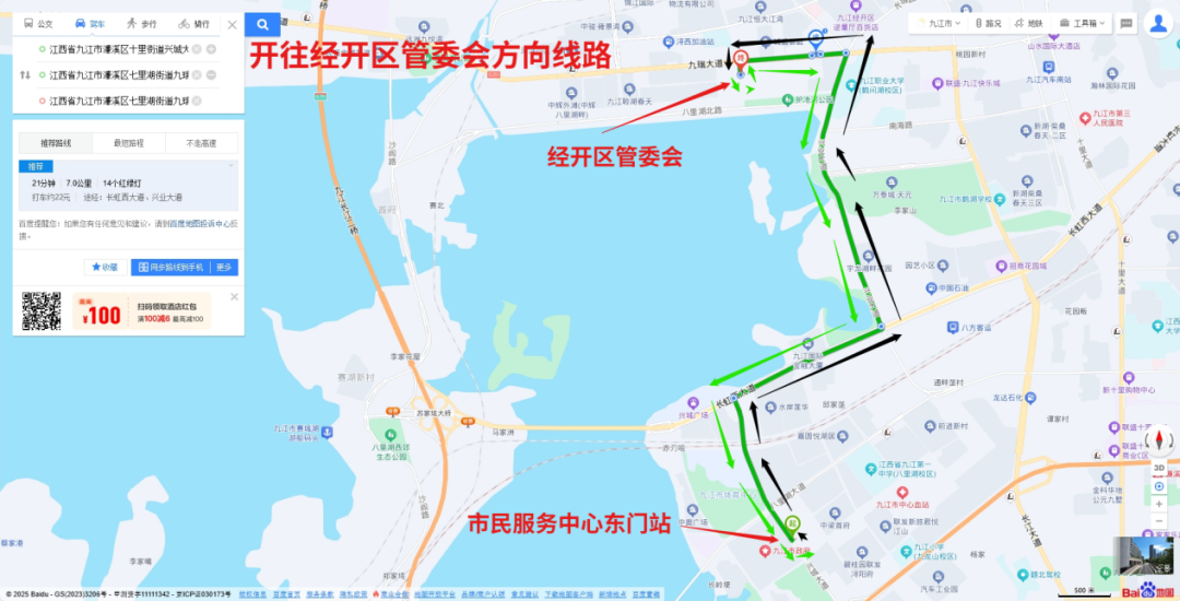 往返路线走向:祥和路东侧(九龙新城A区)—八里湖大道—柴桑路—渊明大道(柴桑区行政服务中心)。车辆停靠沿线公交站点。详见下图: