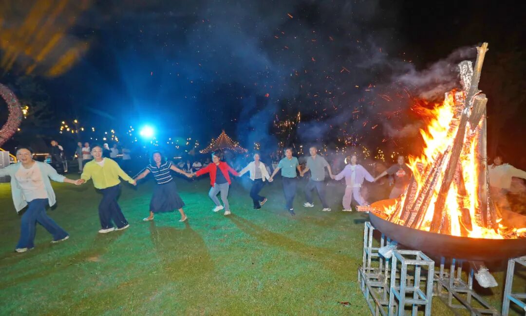 当天下午,游客们率先前往白鹿洞书院与观音桥游览。在白鹿洞书院,千年文脉浸润人心;站在观音桥上,庐山山水尽收眼底。夜幕降临,庐山花语世界的篝火晚会点燃了现场气氛。火光摇曳中,游客们与当地工作人员载歌载舞。