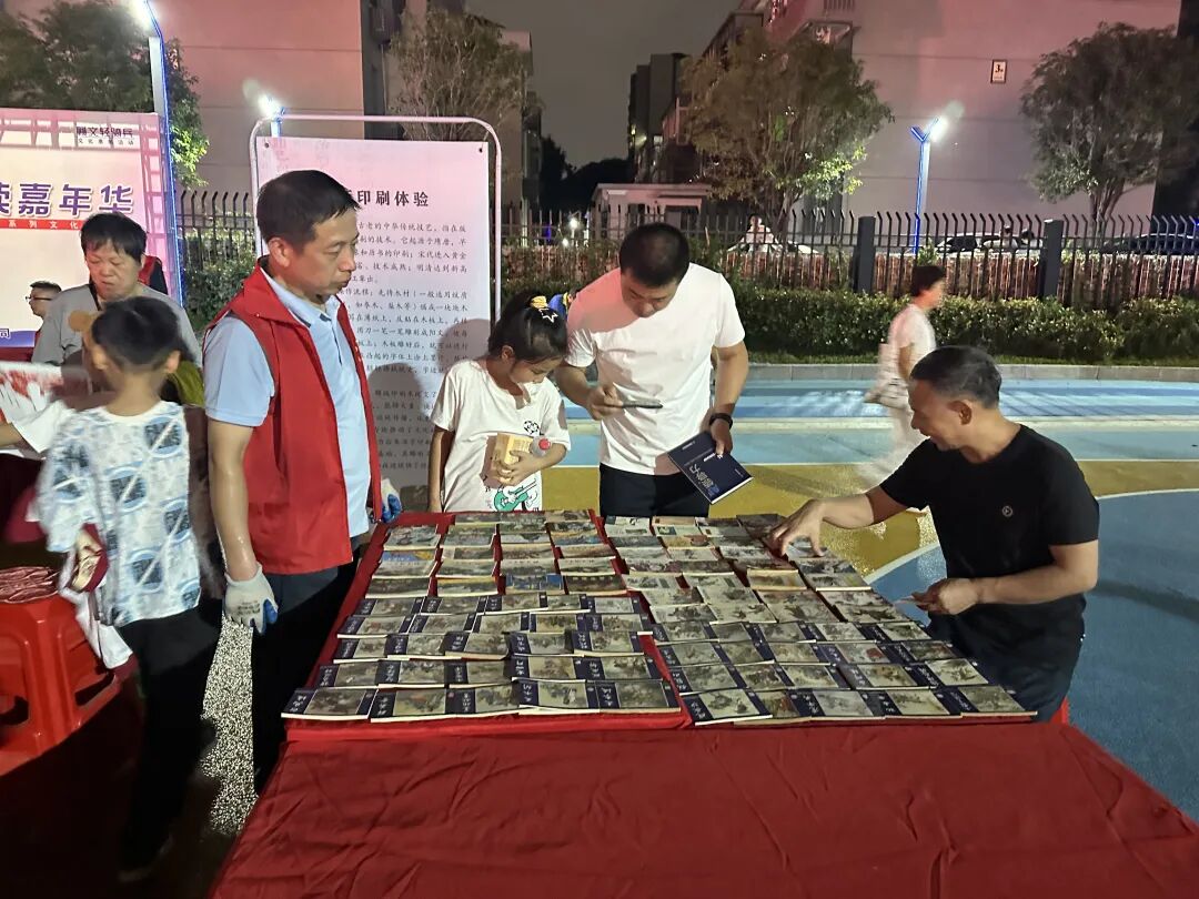 传统文化体验是本次活动的亮点,处处彰显作风建设成效。小人书专题展览精选馆藏经典小人书,涵盖《水浒传》《三国演义》等百余册经典作品,泛黄的书页承载着几代人的阅读记忆,居民们纷纷驻足翻阅。拓印体验台前格外热闹,党员志愿者们手把手指导孩子们,将傲骨寒梅图、寿字图等拓印在宣纸上,让孩子们在趣味中体验中华优秀传统文化的魅力;更有复刻的雕版九江老地图,让居民在拓印过程中触摸浔阳古城。投壶游戏区更是热闹非凡,孩子们争先恐后模仿古人姿势投箭竞技,欢呼声中传递着传统游艺的魅力。干花书签 DIY 区里,家长与孩子协作剪裁、粘贴,把对自然的热爱凝结在小小书签中。