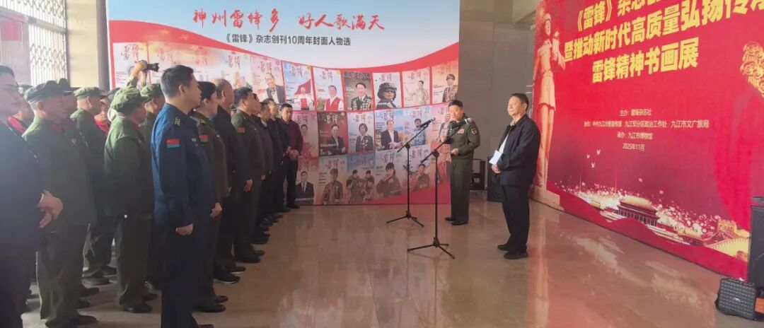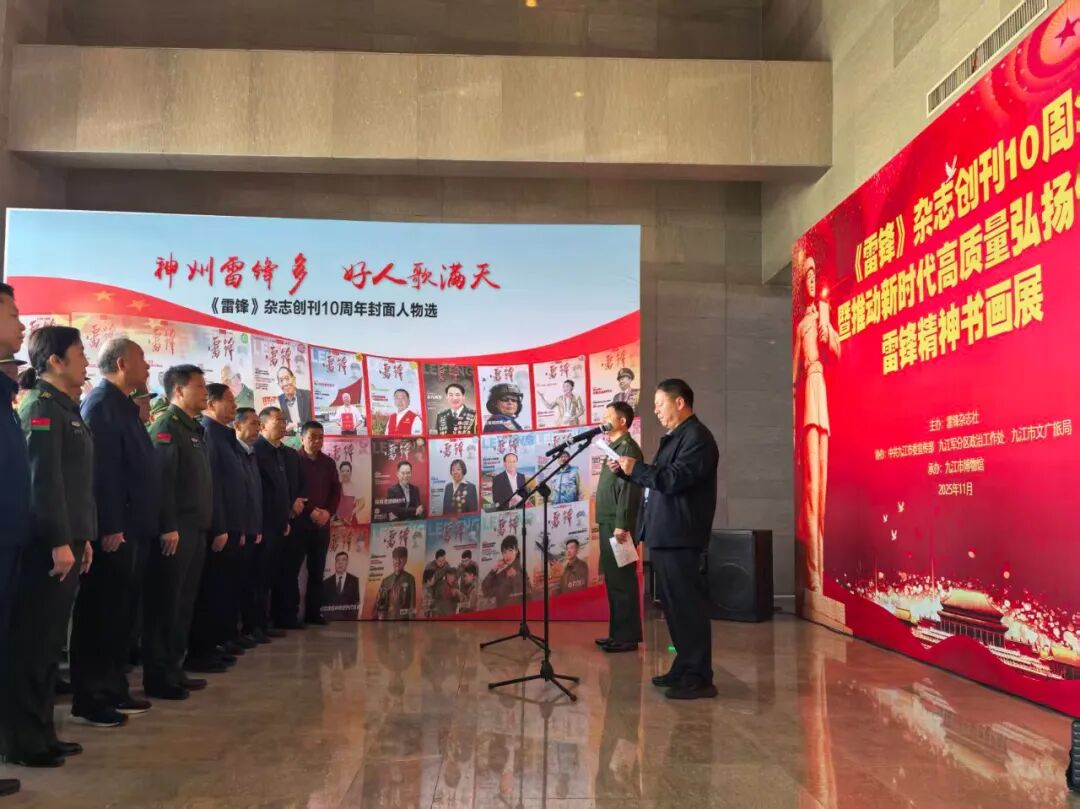 此次展览阵容强大,雷锋杂志社一行8人、九江市委常委、军分区司令员丁庆顺,市委宣传部部长、一级巡视员孙金淼、九江军分区政委袁俊峰等领导出席;还有九江市爱国拥军促进会老兵合唱团、九江市“新长征”退役军人志愿服务队等退役军人代表;九江市书法协会、美术协会等书画界人士,以及社会各界“雷锋情怀”践行者参与。开幕仪式由雷锋杂志社副总编史照栋主持;丁庆顺司令员在致辞中强调,书画展是用艺术语言诠释雷锋精神的创新载体,既是对杂志创刊10年的纪念,更是推动雷锋精神在新时代落地生根的重要实践。