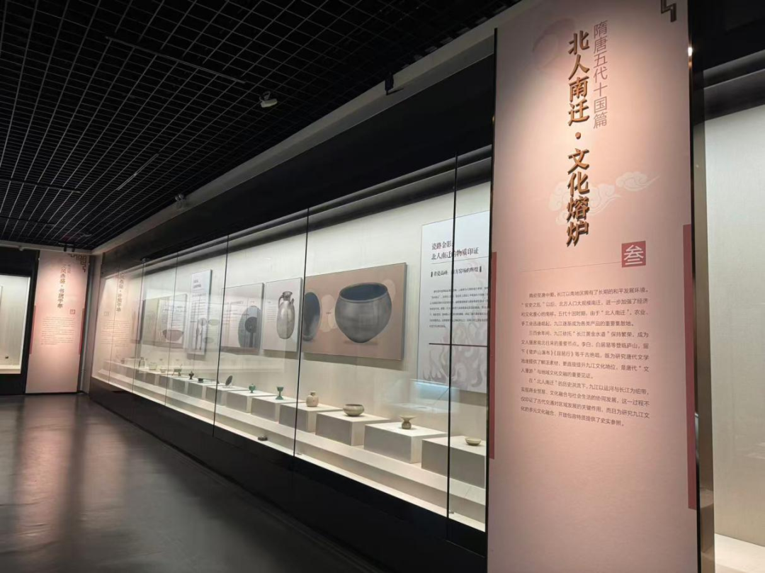 展品充分体现不同历史时期九江地区的文化融合。如三国两晋南北朝时期,东晋 “东林寺乞米” 款陶罐反映佛教文化在九江的传播,南朝青瓷莲瓣纹六系罐展现佛教艺术与本土青瓷工艺的结合;隋唐时期的三彩莲花盂,以莲花为造型融入佛教文化元素,是南北工艺与宗教文化交融的实物见证,体现多元文化对九江地区的影响;宋元时期,白鹿洞书院、东佳书院等相关文化遗存,以及江西诗派的文学成就,展现了文教与文学艺术的融合繁荣,让观众感受九江多元包容的文化特质。