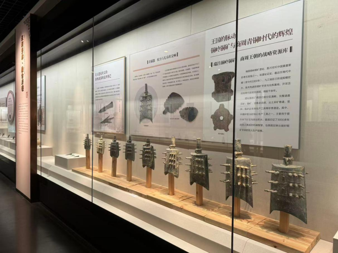 展览紧密围绕九江与长江文明的互动发展脉络,通过文物实证九江作为长江文明重要区域,在不同历史时期的独特贡献。例如瑞昌铜岭古铜矿遗址相关文物,证明九江地区在商代就是重要的铜矿开采冶炼基地,为研究长江流域青铜文明提供关键物证;明清时期九江作为 “三大茶市”“四大米市” 的相关文物,展现其在长江流域商贸网络中的重要地位,深化观众对长江文明区域互动的认知。