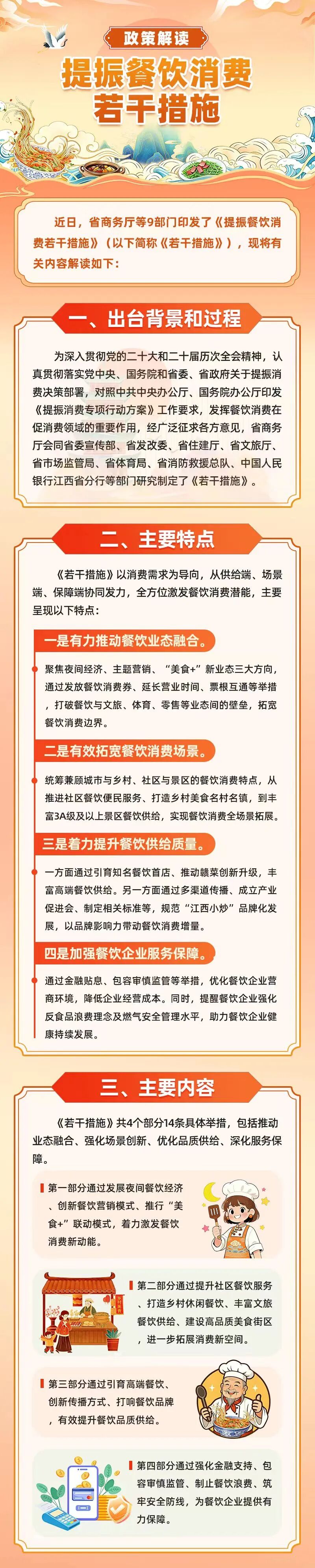 江西省9部门近日联合印发《提振餐饮消费若干措施》(以下简称《若干措施》),着力激发餐饮消费新动能,推动餐饮业高质量发展。