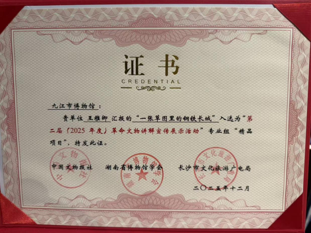 12月23日,由中国文物报社、湖南省博物馆学会、长沙市文化旅游广电局主办的“第二届革命文物讲解宣传展示活动”终选会在湖南长沙圆满落幕。在这场汇聚全国文博界精英的巅峰对决中,九江市博物馆斩获佳绩——报送的讲解作品《一张草图里的钢铁长城》凭借深厚的红色底蕴、创新的呈现形式与深刻的精神内涵,荣获第二届专业组“精品项目”。