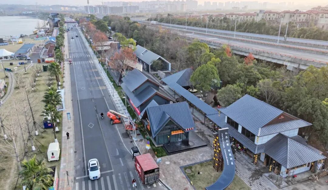 作为2025年全市文旅攻坚重点工程,九派之眼·休闲街区的打造备受关注。街区总长350米、宽30米,新建的28栋装配式建筑风格简约大气,搭配精心设计的空中栈桥,不仅实现了核心街区与湖畔营地的无缝衔接,更成为观赏九江“山江湖城”的独特观景台。街区紧邻九派诗廊,人文底蕴深厚,同时坐拥水上乐园、露营基地等特色配套,聚焦潮流亲子、主题餐饮、创意市集、咖啡书屋四大核心板块,让传统韵味与潮流活力在此交融共生。