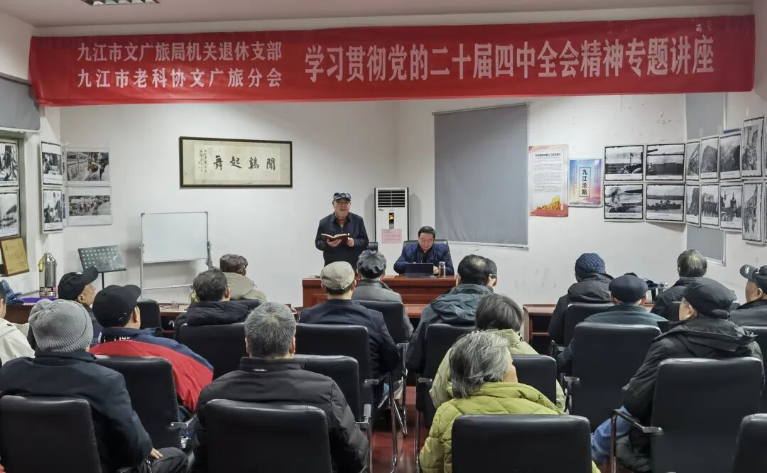 为深入学习贯彻党的二十届四中全会精神,12月24日,市文广旅局机关离退休党支部,市老科协文广旅局分会举行学习贯彻党的二十届四中全会精神宣讲报告会。市委宣讲团成员、党史理论专家蔡杰作宣讲报告。局机关离退休第一党支部书记,市老科协文广旅分会会长王敬宪主持报告会并讲话。局机关离退休第一、第二党支部党员,市老科协文广旅局分会理事会成员,部分老专家、老学者、老艺术家聆听报告。