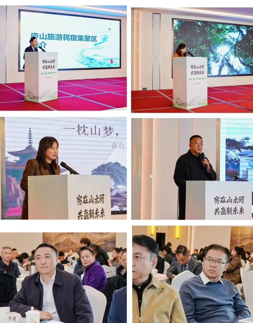 推介环节精彩纷呈。庐山旅游民宿集聚区推介官重点介绍了庐山民宿集群的独特优势、文化内涵与高品质服务,描绘出“朝观云海、夜枕星辰”的休闲度假画卷。随后,来自庐山、庐山西海、武宁、永修等地的精品民宿主理人依次上台,结合生动讲述与精美影像,深情推介各自民宿的设计理念、周边景观、特色活动与温馨服务,全方位展现了九江民宿的多元风貌与文化底蕴。驻昌商会代表也登台“为家乡代言”,以乡情为纽带,热情邀请在昌乡贤及各界人士常回九江,亲身感受家乡的山水之美与民宿之趣。