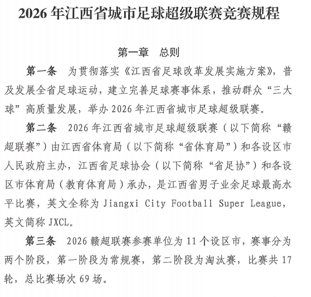 近日,《2026年江西省城市足球超级联赛竞赛规程》正式发布。根据规程内容,2026年江西省城市足球超级联赛(简称“赣超”)将由全省11个设区市组队参赛,以城市为单位组建代表队。赛事分为两个阶段,第一阶段为常规赛,第二阶段为淘汰赛,比赛共17轮,总比赛场次69场。