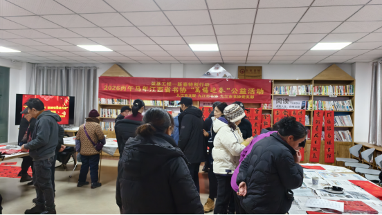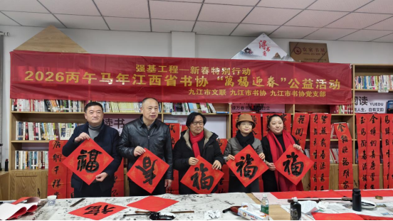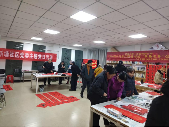 1月30日,九江市委宣传部、九江市文联、九江市书协联合金鸡坡街道新塘社区共同举办“笔走龙蛇贺马年,联赠邻里进万家”迎新春写春联活动,4位本土书法家现场挥毫泼墨,为居民书写200余副春联,将新春祝福送进千家万户,营造出浓厚的节日氛围。