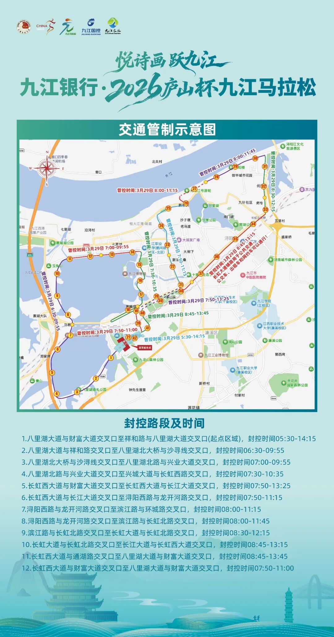 九江银行·2026“庐山杯”九江马拉松将于3月29日上午7:30在九江市中心城区开赛。为保障赛事的顺利进行,确保在赛事期间交通安全、畅通,根据《中华人民共和国道路交通安全法》相关规定,决定对部分道路实施临时交通管制措施。现将有关事项通告如下:
